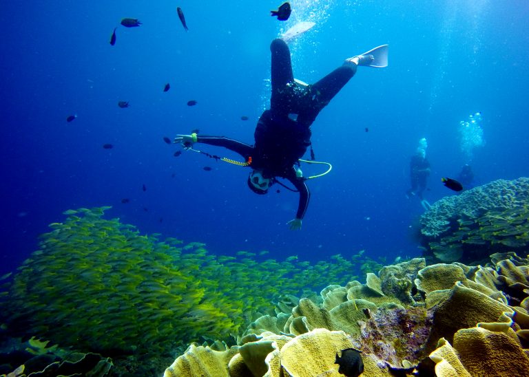 「自由潛水」就是用一口氣的時間潛到海底,至於能潛多久、能潛多深,就各憑本事啦!「自由潛水」又稱為「徒手潛水」,意思就是不帶任何的裝備,只靠著面鏡、蛙鞋潛入水裡。這個被我們列為極限運動的活動,說來可笑,其實也就是每一個當地漁民都會的基本技能呀!為了溫飽,每一個孩子從小就開始訓練自由潛水、打魚、釣魚,所以自由潛水也自然地成為了他們的生活必備技能之一。來到愛妮島的旅人們,也可以試著體驗自由潛水的樂趣唷!